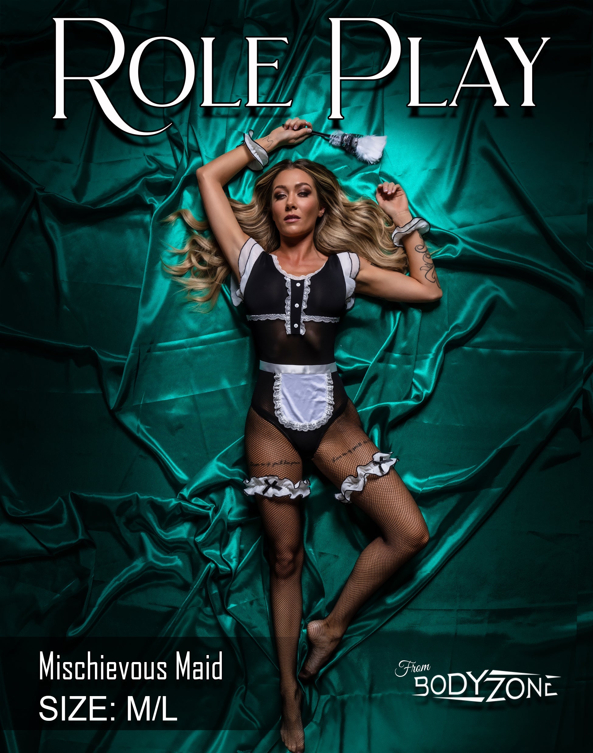 Halloween is just around the corner! Time to make mischief! This 6-piece Mischievous Maid set is perfect for cleaning up any kind of trouble. With a bodysuit that clasps, a tie-back apron, arm and leg cuffs, some fishnets, and a duster, you'll be ready to get down and get cleaning! 🤪